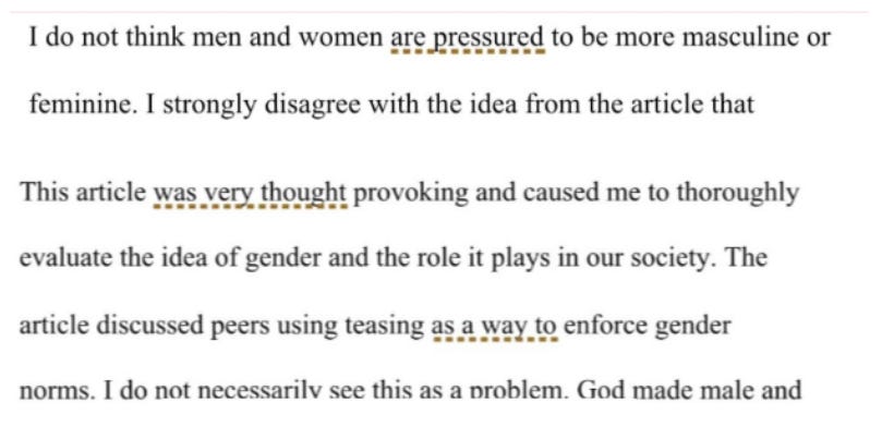 I read the essay and the grade rubric, and while it does say she read the article, none of her actual criticisms are of the actual article, but the general idea of gender roles. The essay was supposed to be a response to an article titled “Relations among gender typicality, peer relations, and mental health during early adolescence.” The topic was how gender expectations affect the mental health of adolescents, but none of her criticisms were actually about how children being bullied about gender roles affect their mental health. The student also contradicted herself; she states in one part of the essay that “I do not think men and women are pressured to be more masculine or feminine, but earlier in the essay, she says that she doesn’t see peers using teasing as a way to enforce gender roles as a problem.