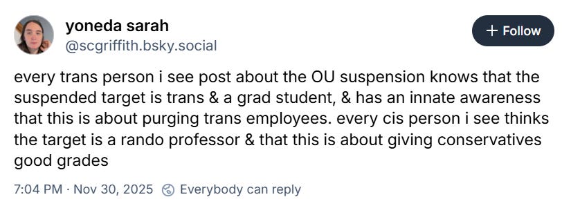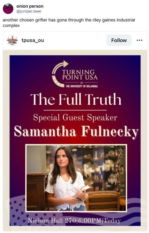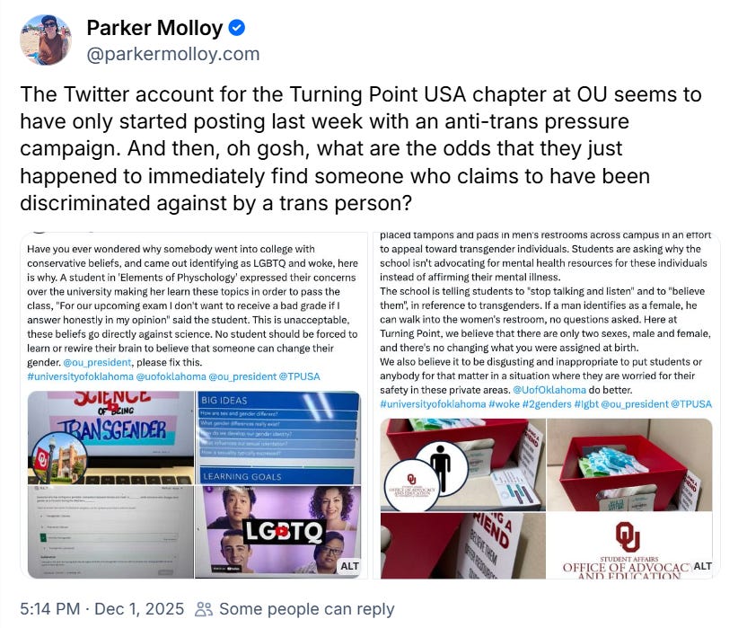 The podcast Kill the Computer had Parker Molloy on their show on December 3rd to talk about it. Parker Maloney pointed out that the Turning Point USA chapter for Ohio University, or Oklahoma University, seems to only started posting a week before the story went viral, with a post that was anti-trans.