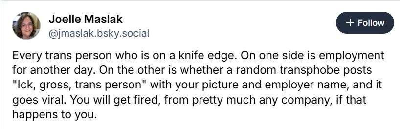 This is going to start to be a pattern. If someone is made to feel uncomfortable due to a situation that is either caused by or related to a trans person, then that person will start complaining and try to make as much noise as possible about it. They will go around complaining about how they are a victim and suffered terribly from being discriminated for their beliefs, then make a career and make a lot of money from spreading anti-trans propaganda.